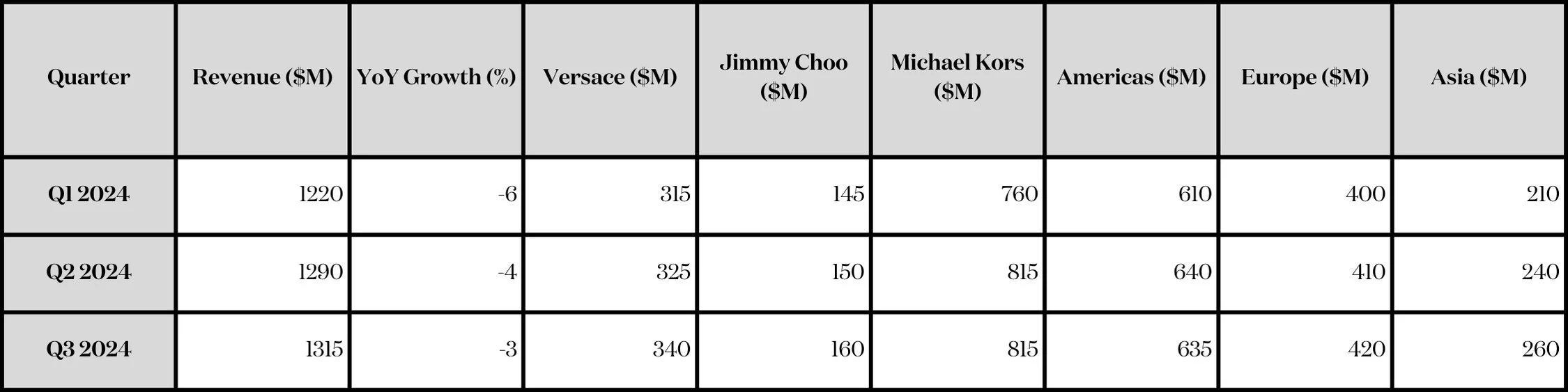 Key Strengths: Versace showed steady growth, with new collections gaining traction globally. Regional diversification supported stability.
