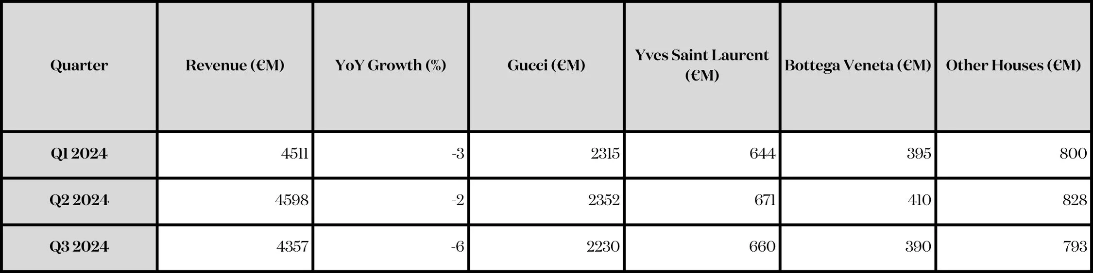 Challenges: Gucci struggled to regain momentum, with YoY revenue declines signaling continued brand repositioning issues.
