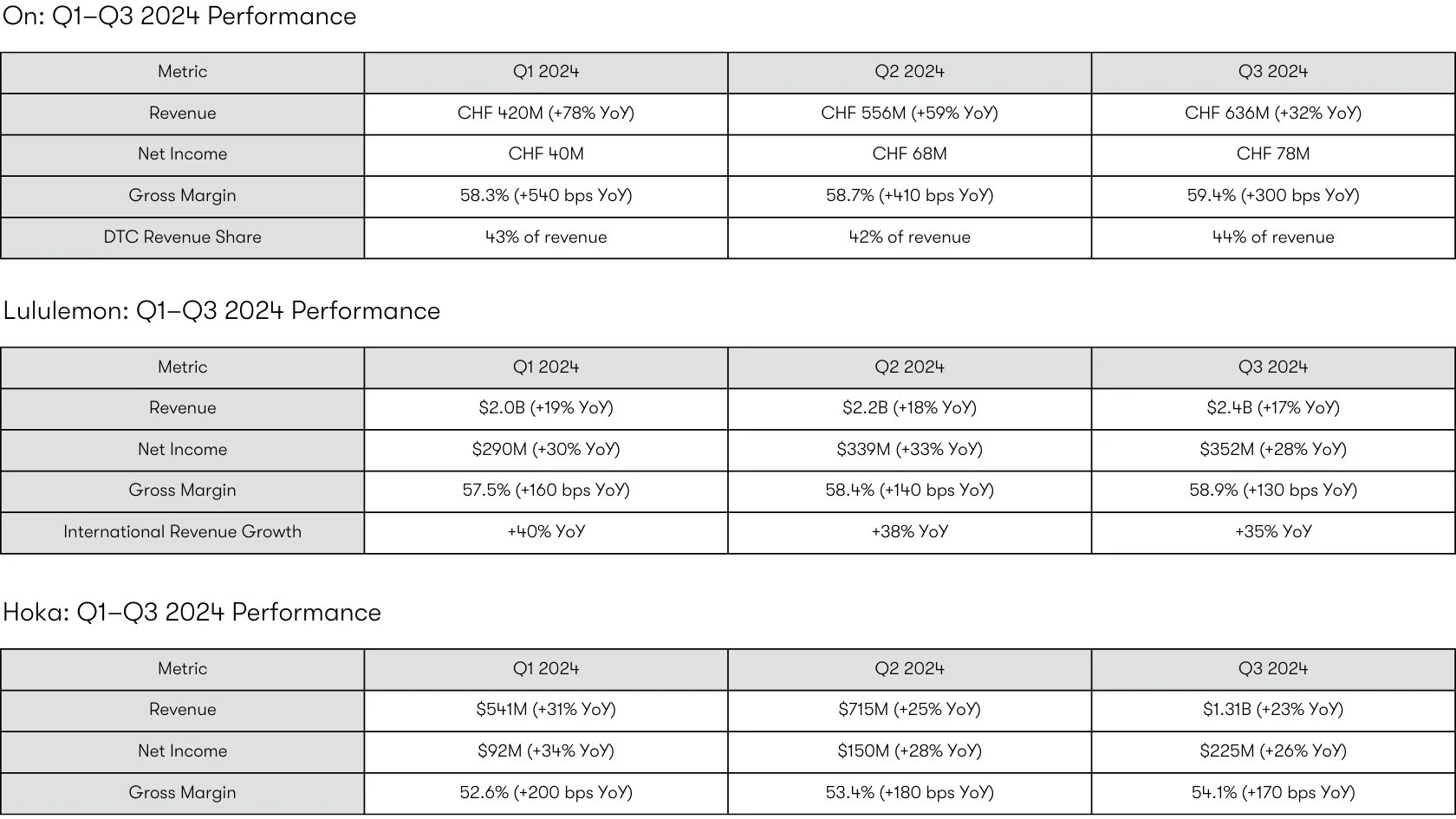 Challenger brands like ON (+59% to +78% YoY in Q1–Q3) and Hoka (+23% to +31% YoY) outpaced legacy players like Nike (flat to +2% YoY) and Puma (+6% to +14% YoY).