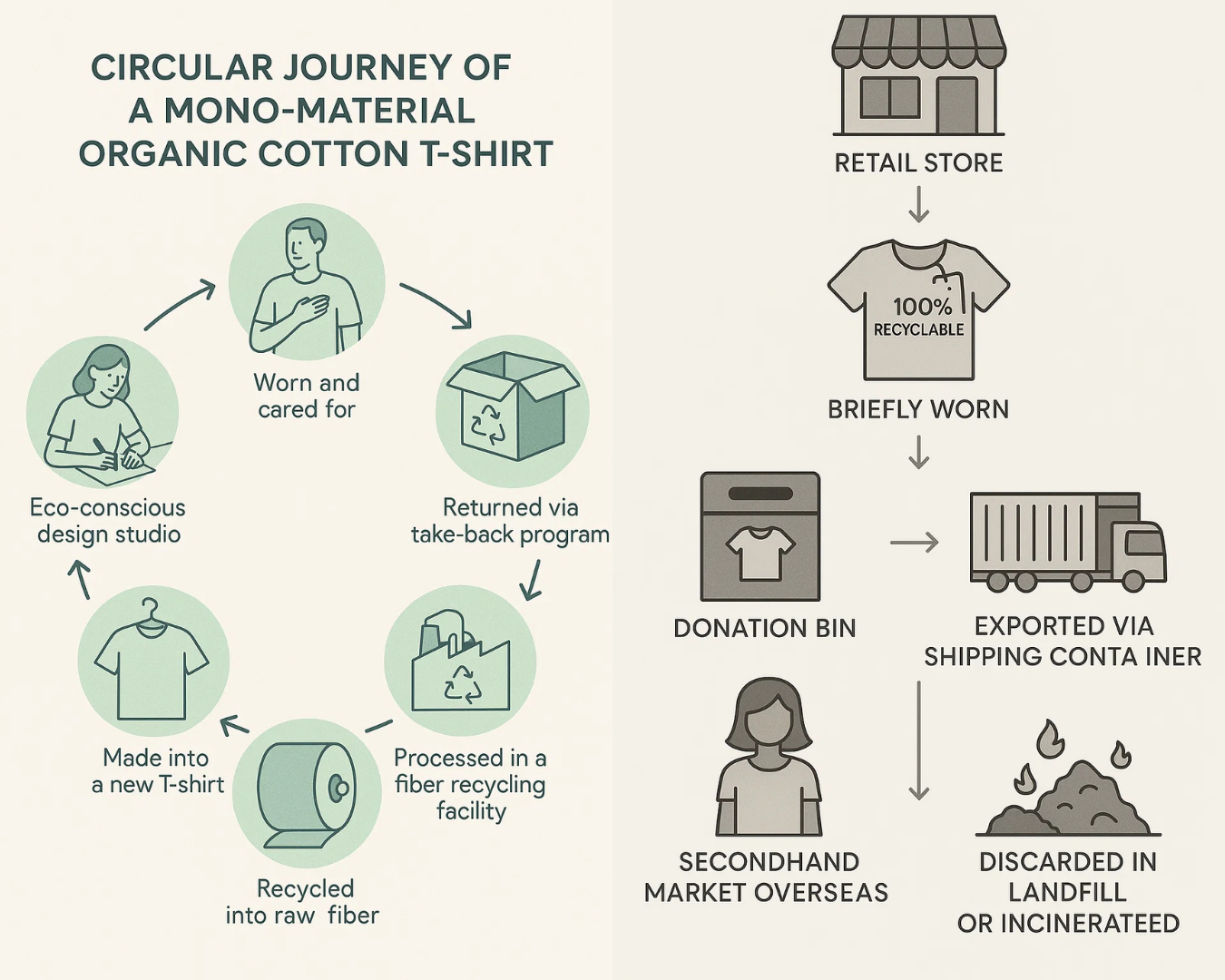 It says 100% recyclable on the tag. Cool. So... where exactly is it going? Because it’s probably not looping back into a fiber mill. More likely, it’s headed to the same place as the rest of our overproduced, under-worn clothes: landfill, incineration, or some overseas donation bin that becomes another country’s problem.